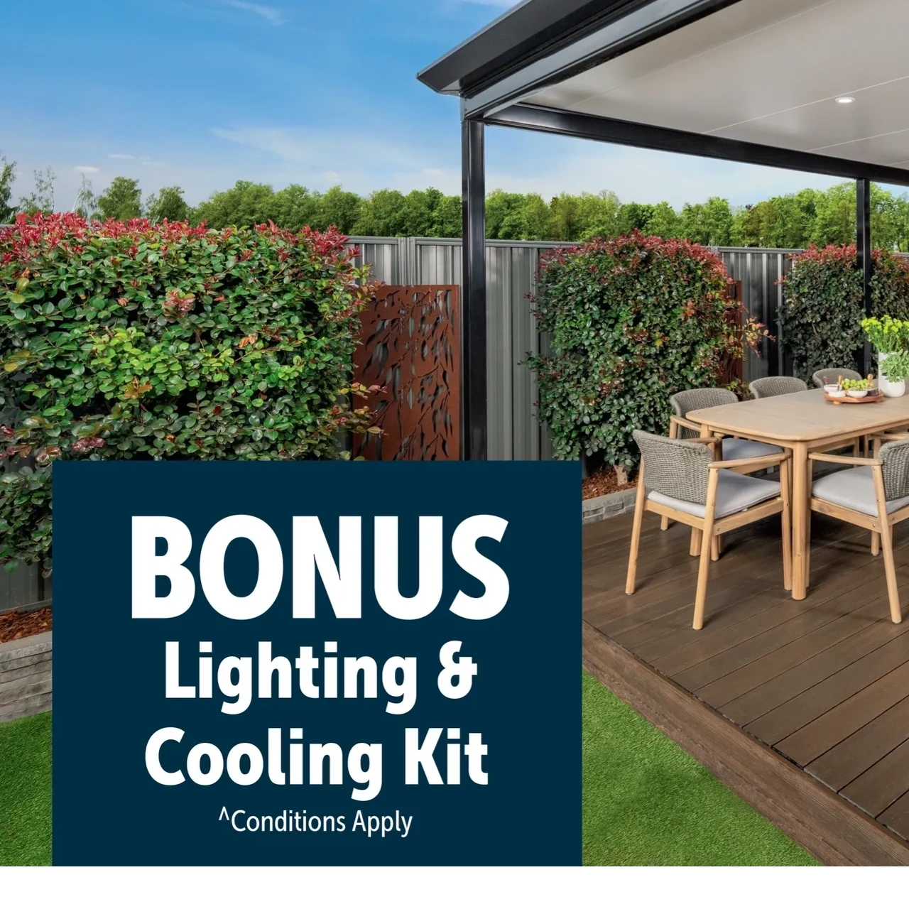 Purchase any Stratco Flat Cooldek Patio or a Stratco New Generation Gable Patio and receive one bonus Outback Ceiling Fan 3 Blade with LED (Black or White) and one bonus LED Ceiling Light Kit (4x5W in white). Minimum patio size of 24m2 applies. (power supply not included)